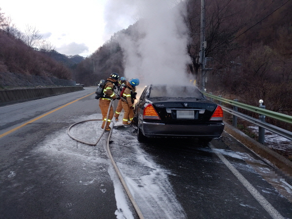 양구소방서, 방산면 도로상 승용차 화재… 차량 전소