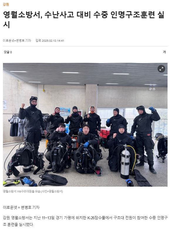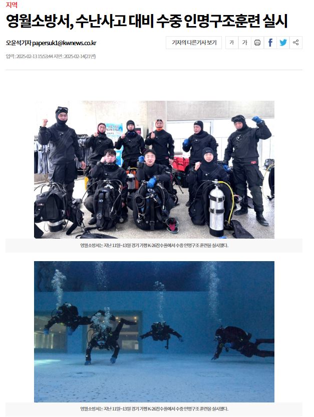 영월소방서는 지난 11부터 13일까지 경기도 가평 K-26잠수풀에서 수중 인명구조 훈련을 실시했다.