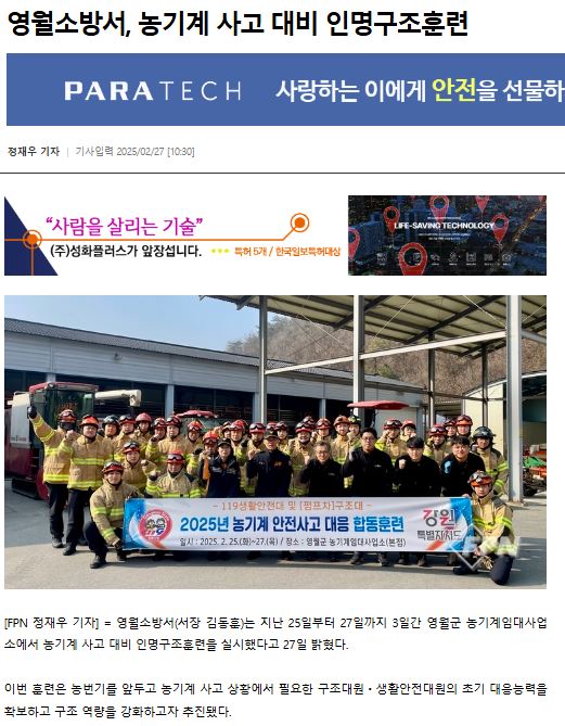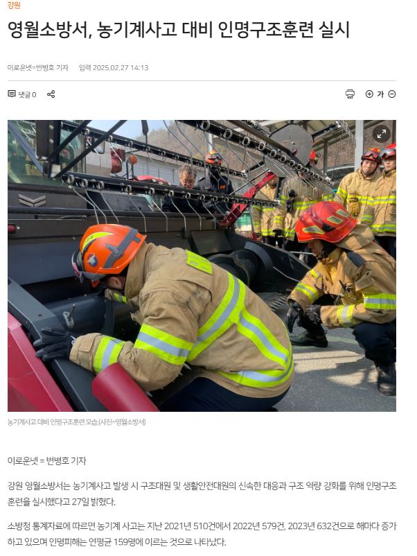 영월소방서(서장:김동훈)는 27일 영월군농기계임대사업소에서 농기계 사고 발생 시 구조 대원 및 생활 안전 대원의 신속한 대응과 구조 역량 강화를 위해 인명 구조 훈련을 실시했다.