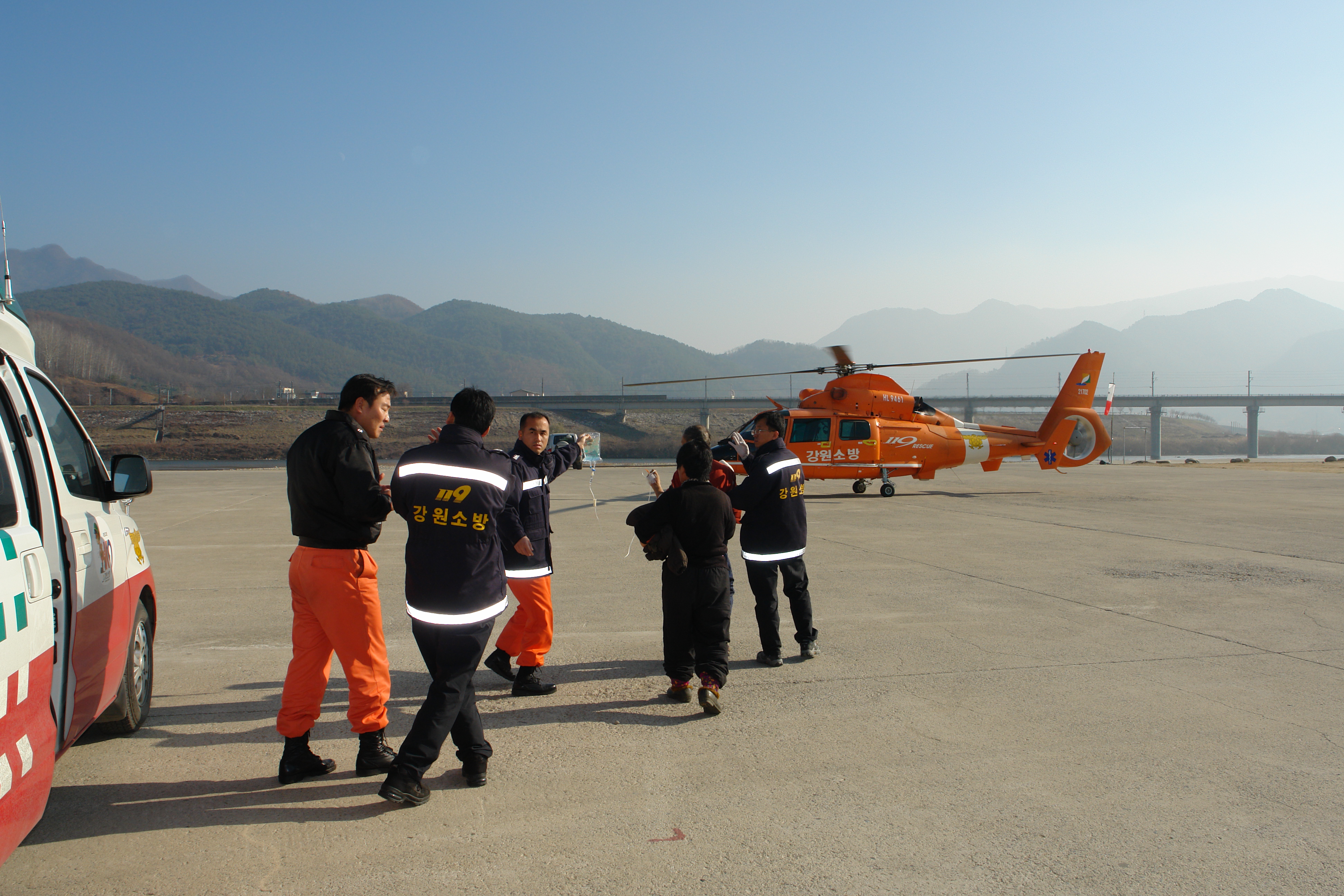 - 2009.11.24. 오후 영월읍 삼옥리에서 남자 63세(정00)씨가 콩 탈곡기에 오른쪽 약지손가락이 절단되는 사고가 발생하여 1차로 병원에서 응급처치 후 접합수술을 하기 위하여 소방헬기 이용 서울에 있는 병원으로 이송하였다.