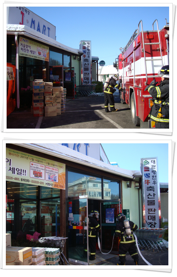영월소방서(서장,김남백) 대관령119안전센터는 화재현장 대응능력 배양을 위하여 2012년 1월 6일(금) 대관령면 횡계리소재 제이마트를 대상으로 현장출동 적응훈련을 실시하였다.