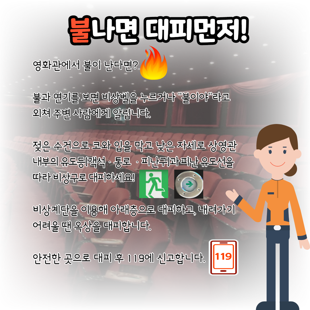 ○ 만약 영화관에서 화재가 발생하면 최우선으로 상영관 내부의 유도등(객석ㆍ통로ㆍ피난구)과 피난유도선을 따라 비상구로 대피해야 한다.