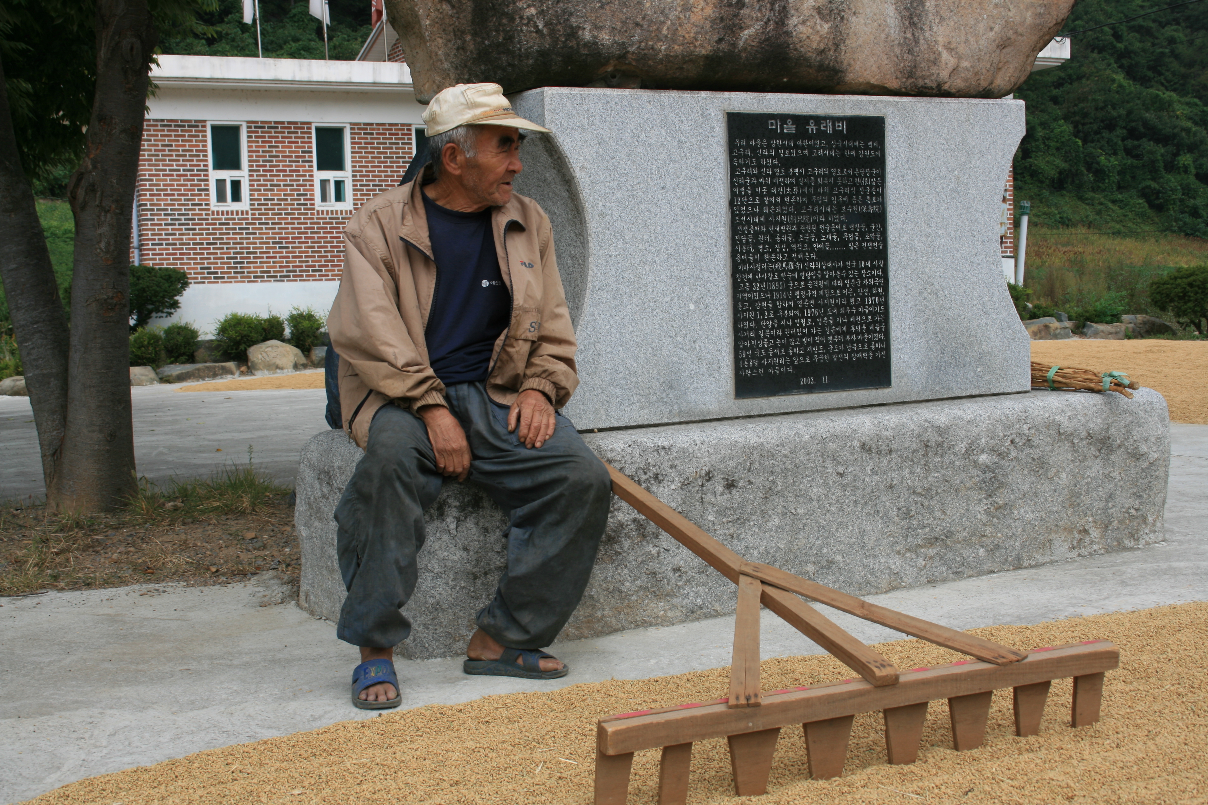 가을 들녁이 온통 황금들판입니다. 이미 추수한 알곡을 따가운 햇볕에 말리는 할아버님의 얼굴에 근심이 가득합니다. 풍년의 기쁨보다는, 쌀값 폭락을 염려해서이겠지요...