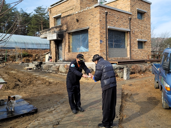 양양소방서(서장 김춘식)는 1. 18.(월) 10:00경 화재피해주민의 피해복구에 도움이 되고자 현북면 장리 정**(남,65세)를 찾아가 강원119행복기금 나눔 강원상품권을 전달했습니다.