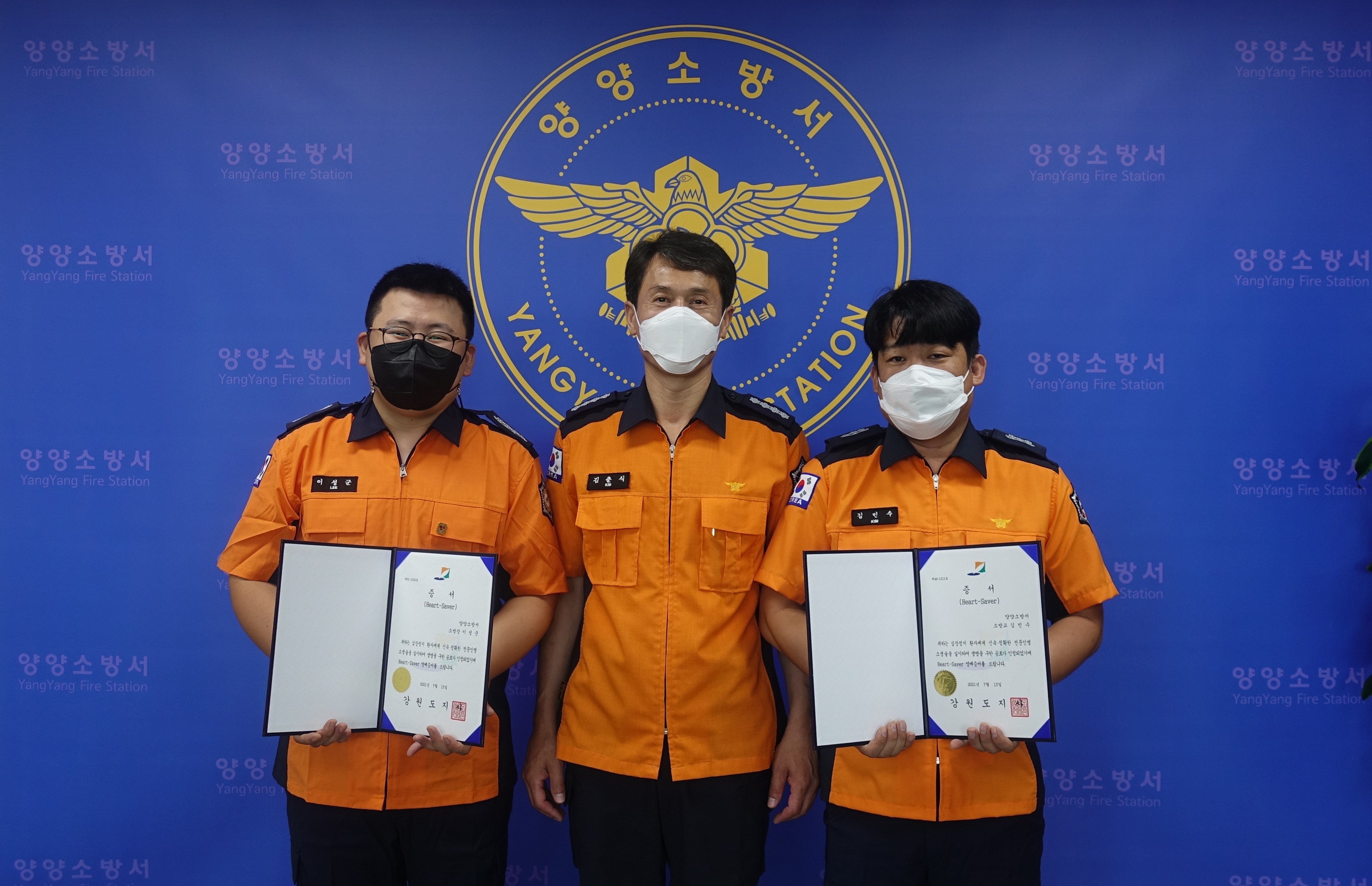 양양소방서는 8월 13일 심정지 환자를 살린 구급대원 2명(소방장 이성군, 소방교 김민수)에게 하트세이버 인증서와 배지를 수여했다.
