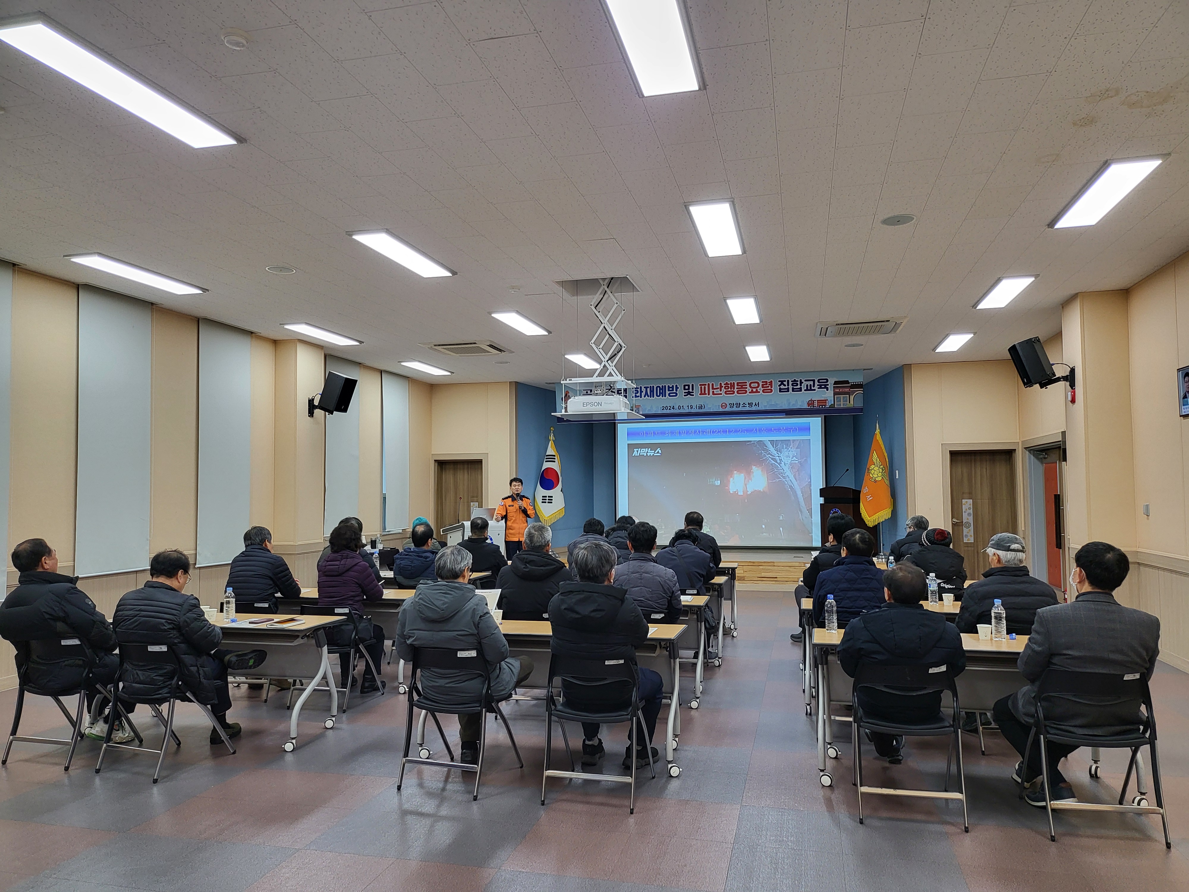 강원특별자치도 양양소방서(서장 김문하)는 2024.1.22(목) 본서 3층 대회실에서 화재 위험과 안전사고가 높아지는 겨울철을 맞아 공동주택 소방 안전관리자를 대상 화재 예방 및 피난 행동 요령 교육 시간을 가졌다