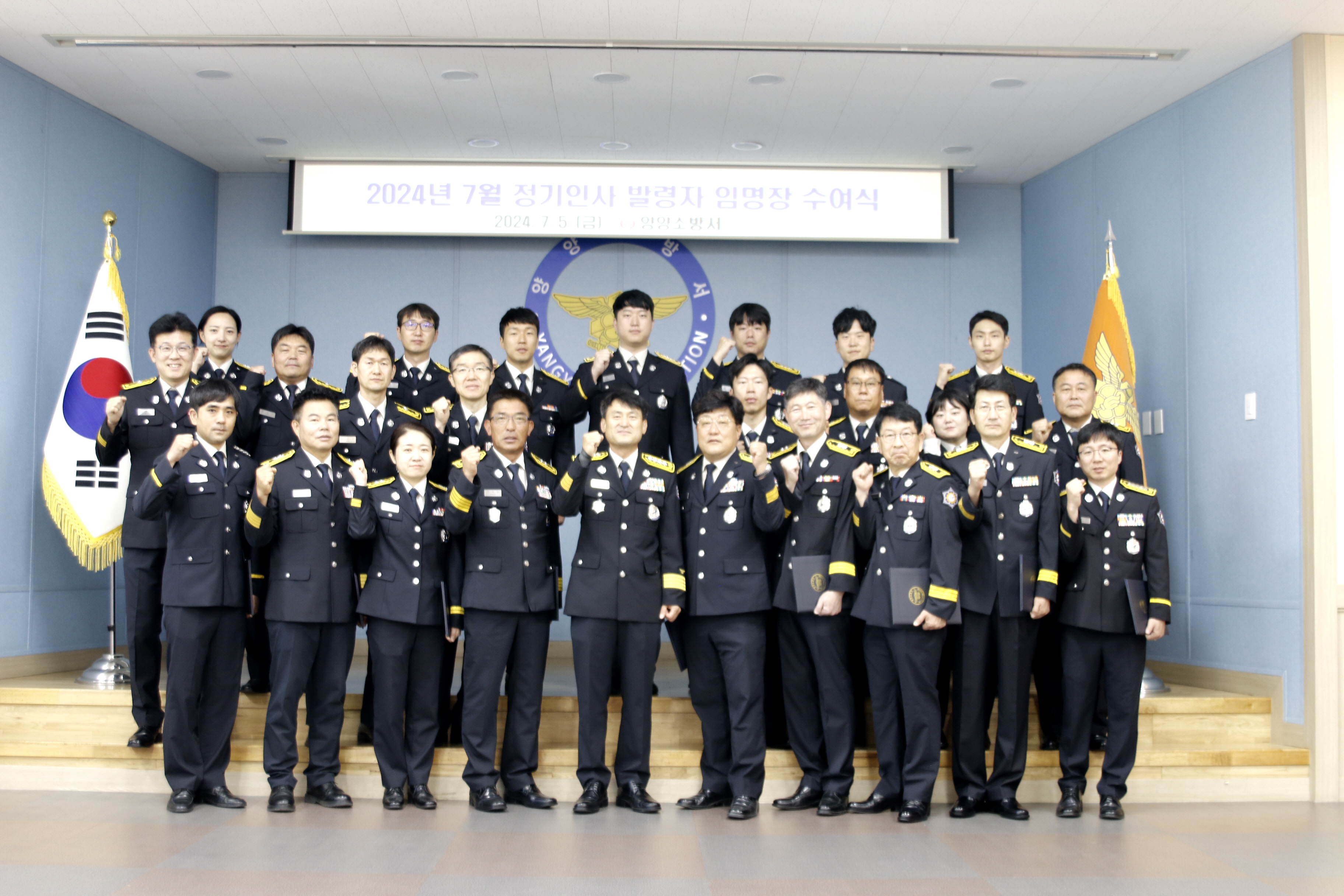 양양소방서(서장 김문하)는 5일 본서 대회의실에서 2024년 하반기 정기 인사발령에 따른 전입ㆍ승진자 임용장 수여식을 개최했다고 밝혔다.